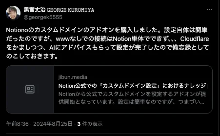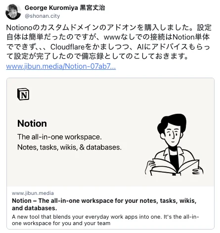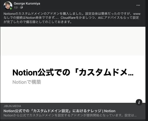 Notionにカスタムドメインを設定して、備忘録を残すことをはじめましたが、SNSでのシェアの見え方がどうなるのだろうかと、試しにXとFb、Blueskyにシェアしてみましたので記録として残しておきます。