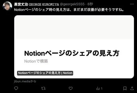 今回はあくまでも備忘録的なものでしたので、不特定多数に読まれることが前提ではありません。そのためOGPを気にして画像を設定するなどはしていません。Notion上ではテキストの冒頭部分がサムネイル的に表示されていますが、外部のSNSではそうならないようです。